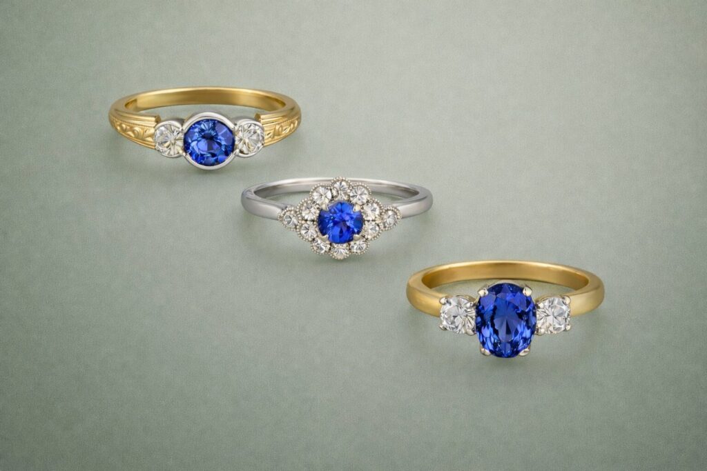 For instance, we show three very different designs above and each design echoes Cross’ philosophy. First, our sapphires are a true blue color, light enough that you can step into the shadows and still see the color blue. You can go for fine dining, low lights, white tablecloth, with a sophisticated wait staff… And in the candlelight you can still see a true blue color.