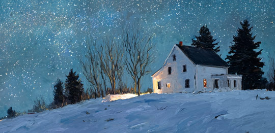 Blue twilight, blue winter white night. The air is crisp and clear, waiting for the first star of evening — waiting even though we’ve known since high school the first star is Venus, a planet. Still, we make a wish. We still throw our lot in with the myth of that first star of twilight.