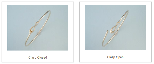 Simple round wire curved open oval, infinity loop on top with a super simple catch. And, if the catch of the infinity spring ever lets go, the bracelet, with its natural spring, will never come off because it always springs back.
