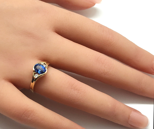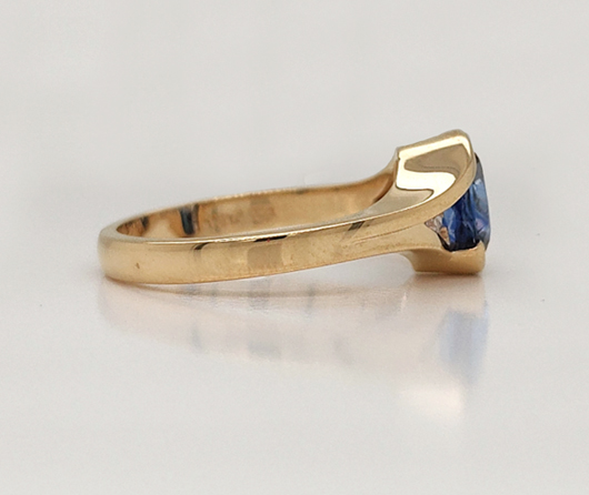 Keith was holding back. He hadn’t shown me the ring yet. I could sense his enthusiasm and because of his track record, I was eager to see it too. He handed me the ring. I was speechless. It was the essence of simplicity. I’d never seen anything like it. It’s not often I see something that is so fundamentally pure and yet no one has ever thought of it before. Part of the magic of this design is the two diamonds tucked in on the inside edges of the big colored gem. They are burnish-set into the lower and upper gold sidelines. I’ve never seen this done before. It creates simple, smooth, clean lines. The two little diamonds simply belong there.