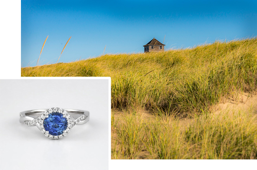 The sapphire in this ring carries that same deep-blue calm. It’s about the size of a one-carat diamond, encircled by a halo of high-white, natural diamonds. Fourteen more diamonds trail gracefully along the sides in a woven rope design, like the lobster lines that have shaped so much of coastal New England. All set in 14-karat white gold, the piece feels like a touchstone you can carry, something to bring you back to wind, sand, and ocean whenever life moves too quickly.