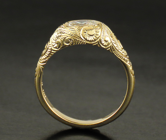 The original ring was beautiful. I gave it to my first born daughter for her 16th birthday. There was a problem. There was a second daughter 3 years behind the first. We immediately began working on a duplicate. We went to William’s chest of drawers with 100 master model rings he had created in the teens and twenties, selected a master like his original, and duplicated it in gold – making another ring for daughter #2. We did all the hand engraving, creating a virtual match to the original.