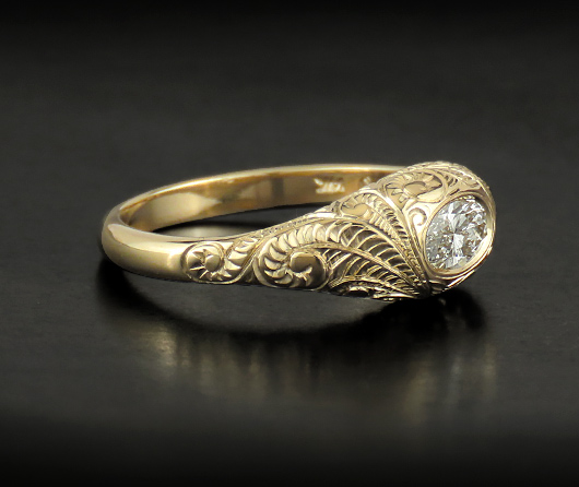 Rendered here in richly detailed engraving of shadow and light. Absolutely gorgeous. Low-profile, practical, wearable, durable… a ring to wear and love for a lifetime.