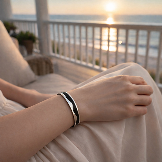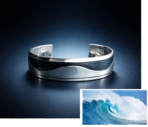 The bracelet is perfect. It’s custom crafted in sterling silver, high polished, antiqued dark, hand finished, low profile, and smooth. Fits 96% of all women. Sleek and modern, wear it anytime, anywhere. Dress up, dress down. It’s smart. It’s sleek. It’s the spirit of simplicity. The High Tide Low Tide design embodies the essence of the wave that circles the globe twice a day, giving rise to our tide phenomenon.