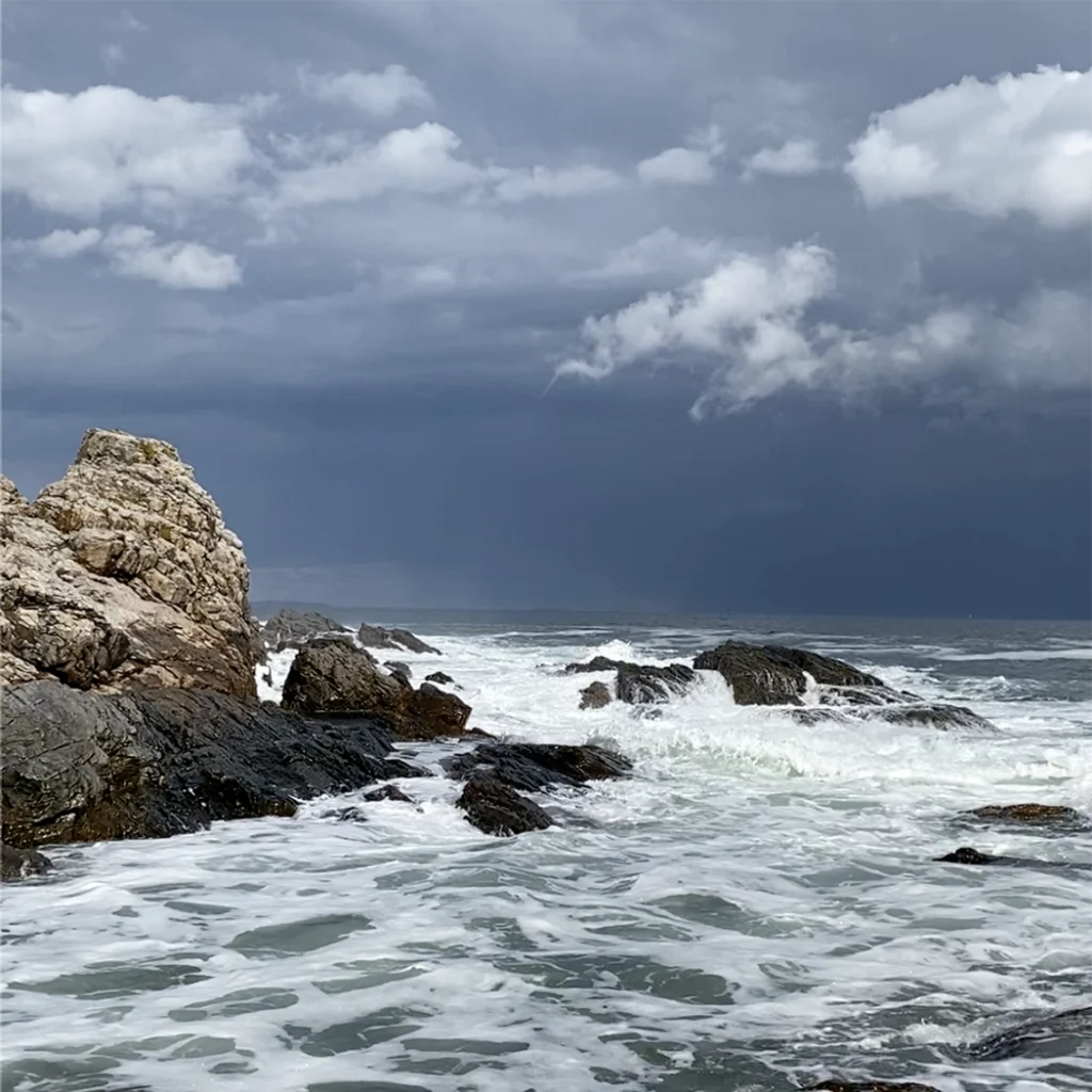 This is a photograph of the rocky coast of Maine with cliffs 30 feet high. It’s interesting, from 200 feet back on a rocky coast, we can’t tell if it is high or low tide. The grey sky above and the silver sea below are like our High Tide, Low Tide bracelet. This photograph is 800 feet down from Portland Head Light looking south.