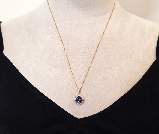 This necklace is beautiful. The tanzanite is sapphire-blue and weighs approximately 1.70 carat. The 24 brilliant round diamonds surrounding and in the articulated bail add approximately .31 ct. total diamond weight. The pendant and 18-inch chain are 14k yellow gold.