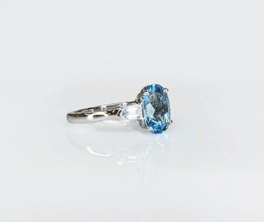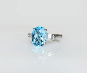 Blue topaz is remarkably well-priced and is often poorly cut. It is possible, however, to cut blue topaz superbly well. The price for a well-cut gem can be double — it’s still a bargain. This gem is 10 x 8mm. It weighs over 3 carats. The gem is Blue Sky – Blue Sea topaz, and superbly cut. It is set into a handmade platinum setting with diamonds.