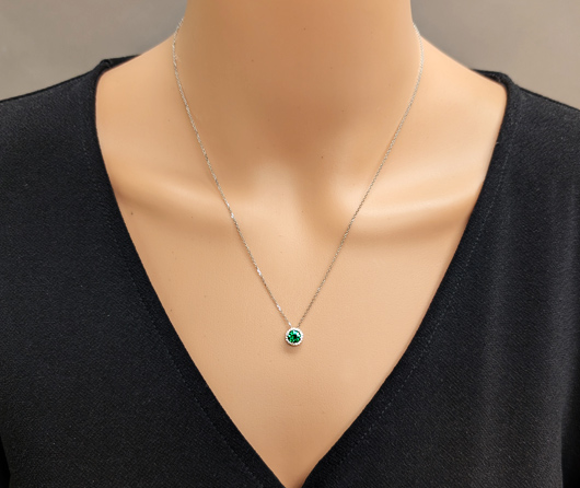 For right now green African garnet is a great value and is the prettiest green gem on the planet. This brilliant green gem is called tsavorite, is 5mm round, and weighs .50 carat. Surrounding the center are 19 diamonds weighing .07 carat. The mounting and 18-inch chain are all 14K white gold.