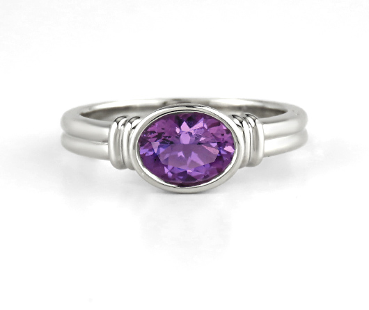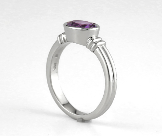 This is a collection is Maine amethyst set in our Lady Captain’s ring, our number one classic lady’s ring design. The center gem is oval or round Maine amethyst. The design has a decades-long mystic appeal. A double band wraps around the finger. The two parallel bars on either side of the center are the captain’s bars. The center gem is set low in a full surround for safety, simplicity, and security. The ring is smooth to the touch and super comfortable.