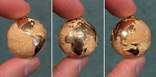 Made in 14K gold, this globe measures one inch in diameter. It’s hollow, but with real presence, weighing in at over 18 grams. You notice it when you hold it. You notice it when you wear it.