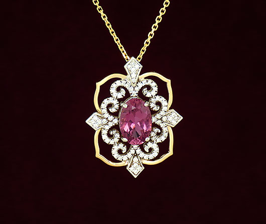 Handwoven lace was the rage in Europe, collars and cuffs for men and women, and skirts with lace edging. Here we have threaded white gold delicately with 97 brilliant white diamonds, then set an unusually long oval, rare pink Maine tourmaline in the middle, and finally framed in all 14K yellow gold.