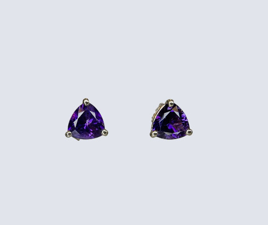 Maine has been blessed with three major gem finds of amethyst. This is a rare pair of Maine earrings. They are a matched pair of triangles close enough to call them a pair. The story of the find in Sweden Maine follows. This a great pair of Maine Amethyst earrings.