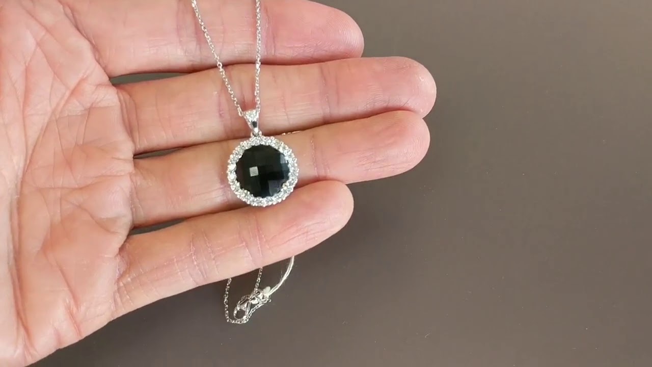 First, the necklace is beautiful – especially dazzling under evening lights at a dinner for two. The big gem is 12mm round. The black star is the sun being eclipsed. There are 16 big facets polished onto the black surface that catch the light and reflect with a glitter of white across its surface. Then, in dramatic contrast, there are 20 diamonds sparkling around the perimeter. The diamonds are the light of the corona.