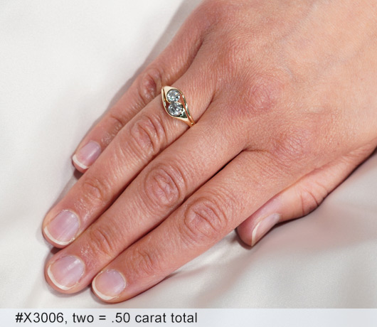 Stones: Two round diamonds = 66dw, Diamonds are Ideal-cut, J Color, SI2 clarity.