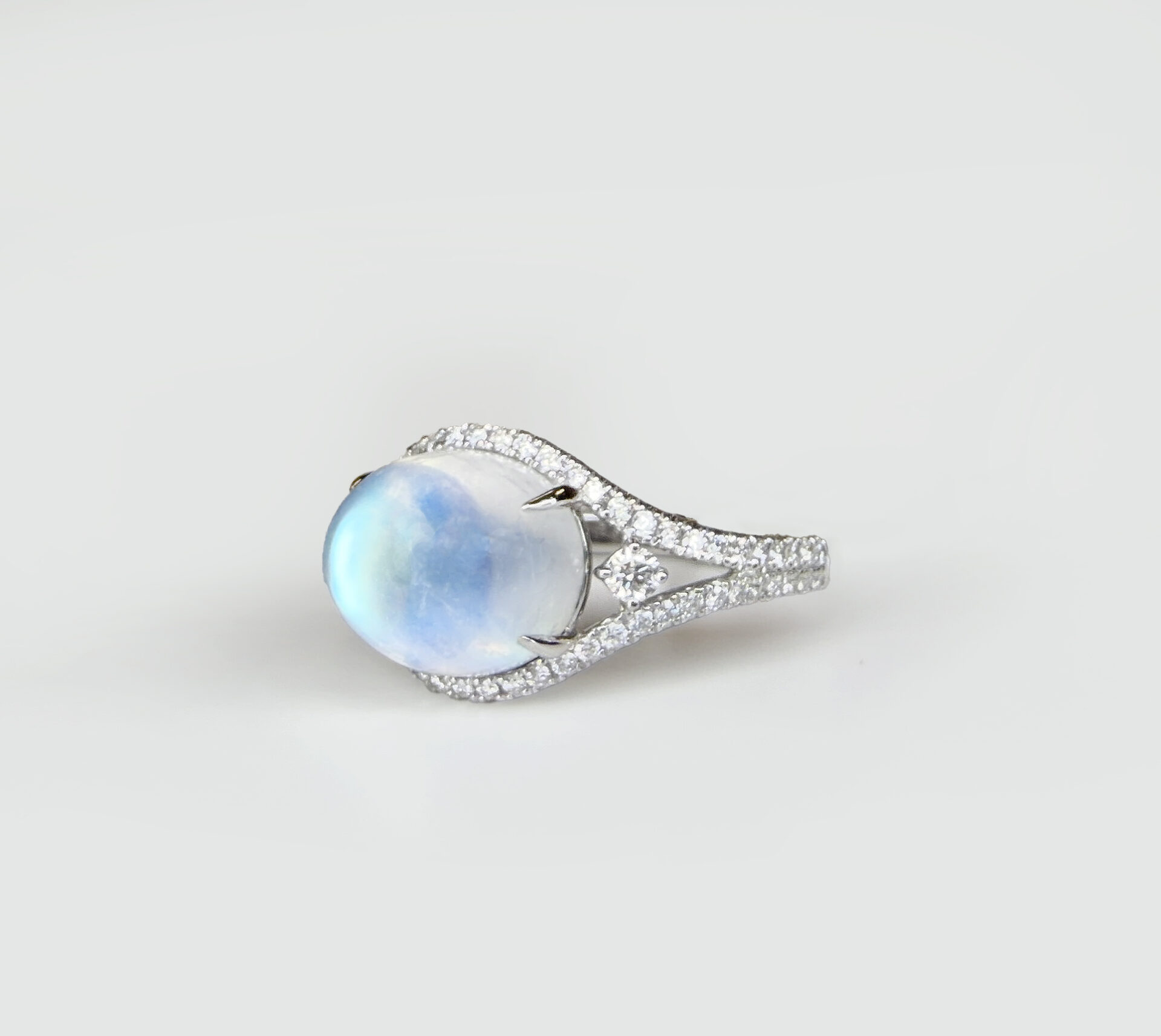 You may have seen moonstone before, this gem is exceptional, it’s rare. The gem measures 11mm long, 9mm wide, and part of what makes this ring extraordinary is the height of the gem at 7mm high. If you look at this ring from the side the center looks unusually high. Its height though, is responsible for the otherworldly, ghostly, floating blue light, hovering at the top of this gem. This gem, this ring is to be saved for special occasions.