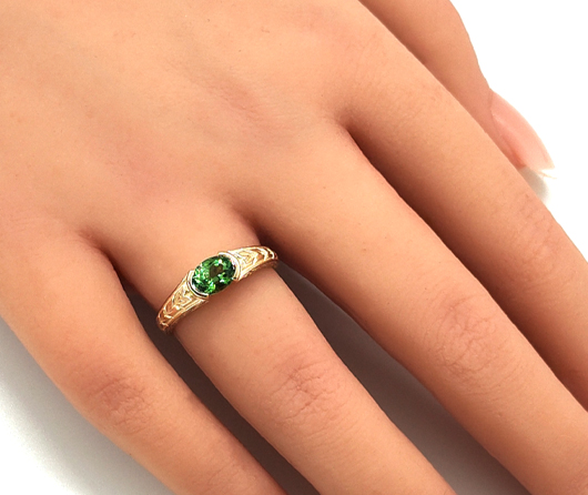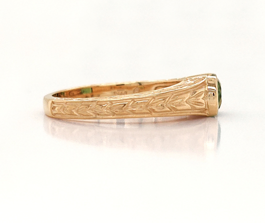 The Mountain Laurel ring is a favorite because of the deep, rich engraving on the sides. When we make it with a green Maine tourmaline, symbolically, it becomes extra special.