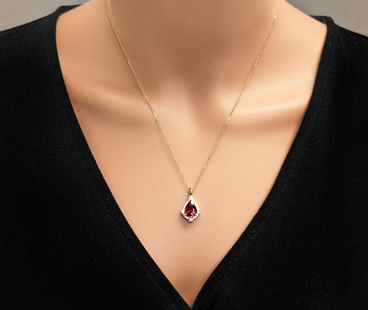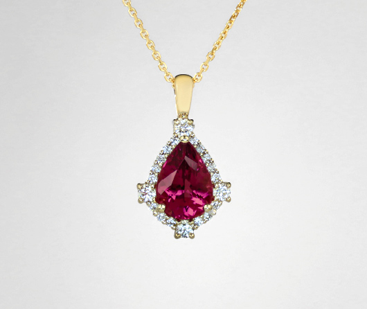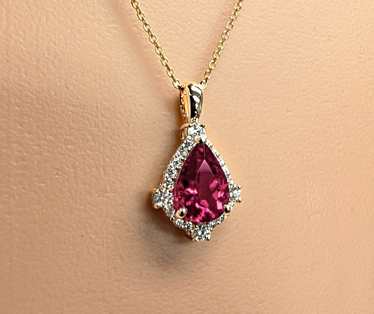 The center gem is pure Maine – a rare pink tourmaline from the 1972 discovery in the western mountains of Maine. The diamonds are all-natural Earth-mined diamonds. Mined deep within the Earth, precision-cut for bright, sparkly brilliance. Together, the gems create a signature piece that, when worn, will be seen in all its glowing brilliance. This is a rare, serious piece of jewelry.