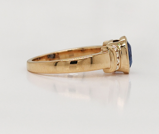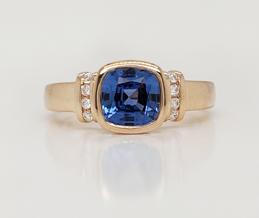 This is my Saturday ring, comfortable, casual. It’s pretty, feminine, but not frilly. Practical, low profile. I can wear it almost anywhere I choose to go.* A beautiful antique cushion-cut center gem in the colors of summer and eight brilliant diamonds. – E.W.