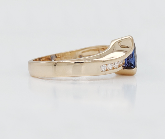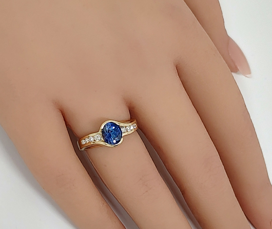 Sea Sense has a subtle twist to it…much like the waves on the sea. In the center is a luscious oval blue sapphire. On the east and west wings, we have 8 graduated natural earth-mined diamonds. In big cities they often make rings tall. We’ve theorized it comes from tall buildings creating tall rings. Here in Maine, we make rings lower and finger-hugging comfortable, which allows you to wear snug fitting Isotoner gloves without your ring catching or snagging.