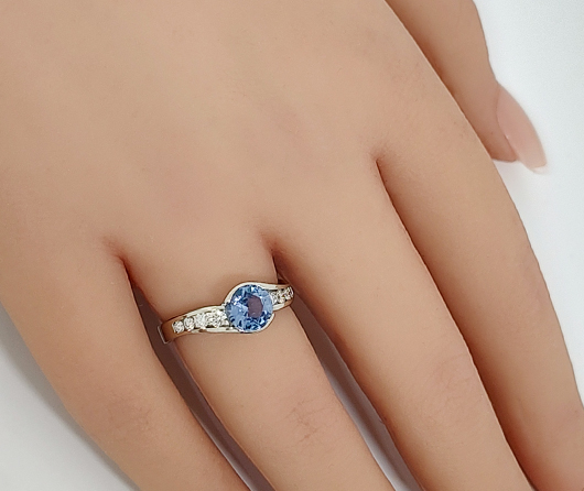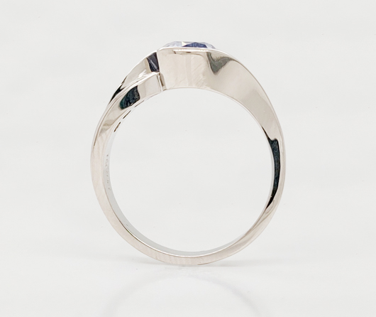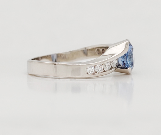 Sea Sense has a subtle twist to it…much like the waves on the sea. In the center is a sumptuous pastel blue round sapphire. On the east and west wings, we have 8 graduated natural Earth-mined diamonds. In big cities they often make rings tall. We’ve theorized it comes from tall buildings creating tall rings. Here in Maine, we make rings lower and finger-hugging comfortable, which allows you to wear snug fitting Isotoner gloves without your ring catching or snagging.