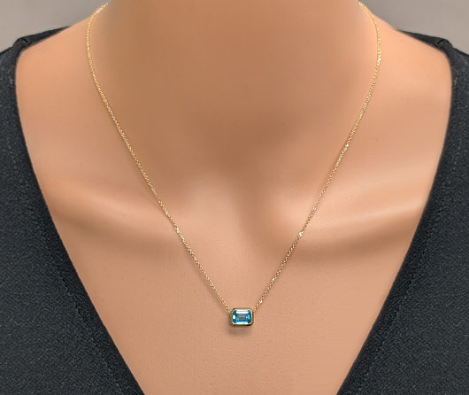 Our Simplicity Necklace is just two elements in their simplest form: gem and gold. The gem is a simple emerald-cut blue sky topaz, a pastel blue, natural, earth-mined gem. The setting is a simple frame of gold with no pattern or decorations surrounding the gem. We have threaded an 18-inch chain so it can move freely through the back, which drops the blue sky topaz to within 2 inches of your heart. The necklace is simple, the necklace is pure.