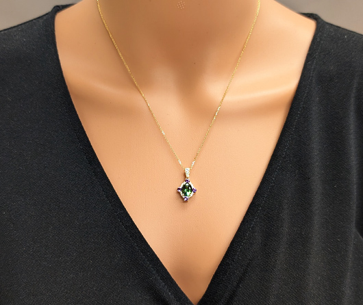 This one is 14K yellow gold on an 18 inch chain. Wear this and everyone you meet will be dazzled. Everywhere you go you will feel the power and presence of not only the colored gem, but the pure magic of the frame of little diamonds that surround.