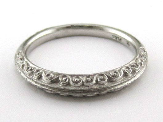 This band carries hand-carved scrolls, each curl deliberate, each line flowing into the next with effortless grace. Romantic in spirit, spun in platinum, it echoes the delicate artistry of a wedding cake — swirls of icing carefully piped, layer upon layer of love and celebration captured in sugared form. Both are works of devotion, crafted by hand to honor life’s sweetest moments.