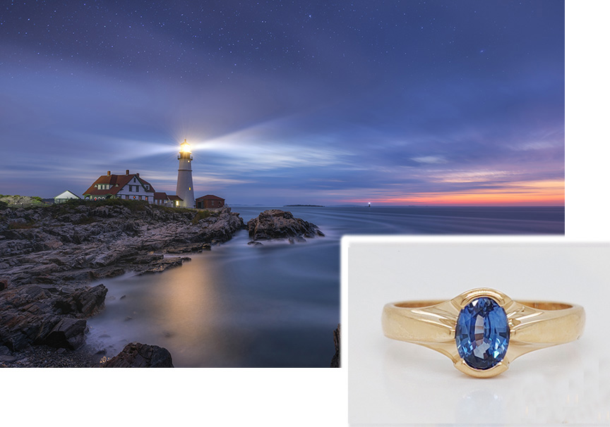 Our new Beacon Ring design is semi-bezel-set north and south to protect the blue sapphire, while two prongs with beacons of golden light hold the gem on the east and west sides. Like the beacon at Portland Head Light, it is a reminder that there is always a safe way home.