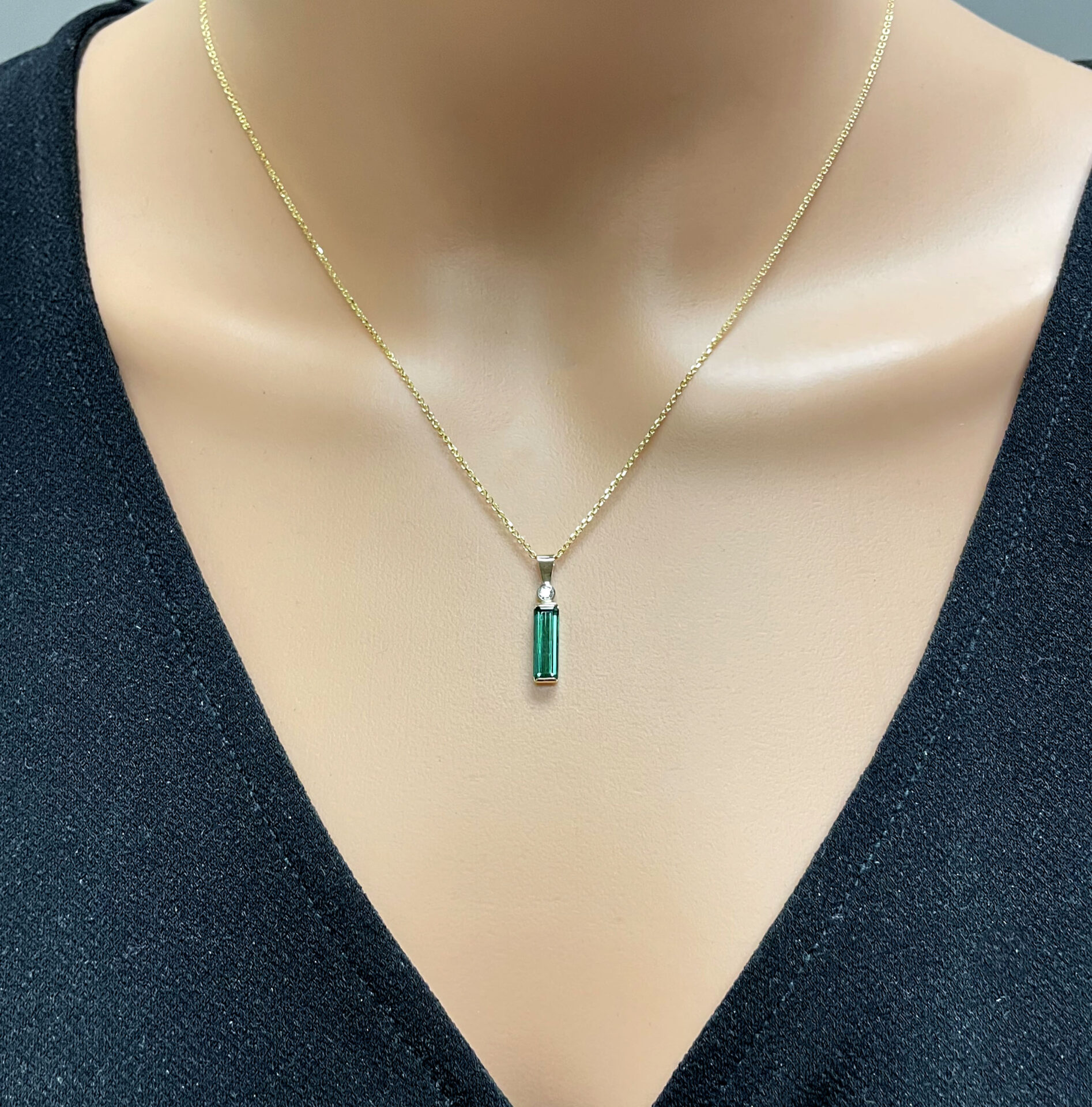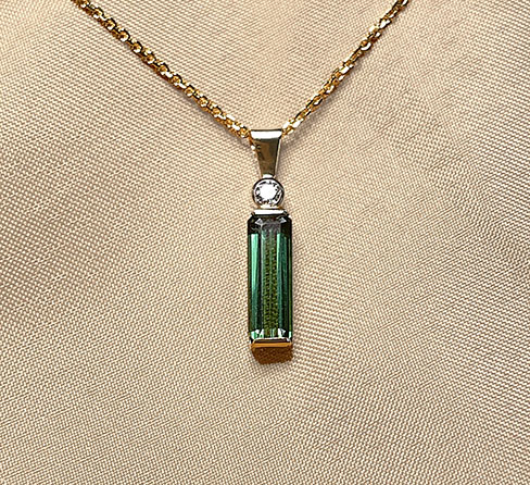 Our necklace is a big natural green tourmaline, found 50 miles north of Casco Bay in the western mountains in Maine. The diamond is a pure white accent piece.