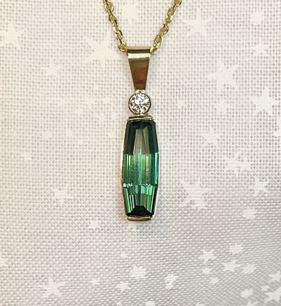Our necklace is a big natural green tourmaline, found 50 miles north of Casco Bay in the western mountains in Maine. The diamond is a pure white accent piece.