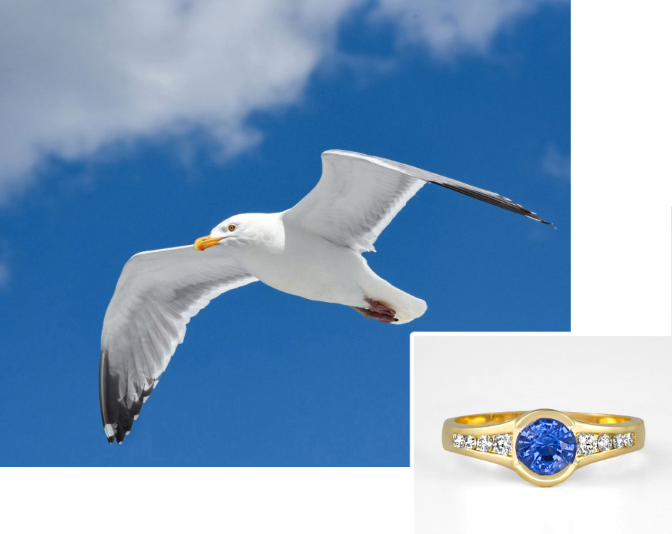 Gulls nest on the sheer cliffs of Whitehead on Monhegan Island. Standing at the top with an expanse of endless blue ocean beyond, where gulls glide on updrafts, is a rare view on the coast of Maine…to be standing above flying gulls. The Gull ring has a blue ocean sapphire center with 8 brilliant white diamonds on the outstretched wings. The ring feels as free as the spirit standing on the cliffs of Whitehead.