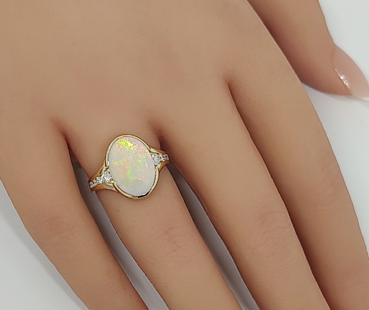 Come to Maine, go to the shore. Find a good chair. Spend a week or two. Around noon a sea breeze usually comes up. This Australian opal is a gentle breeze. the colors changing and floating just beneath the surface. High-white natural earth-mined diamonds  add . carat total diamond weight in the wings.