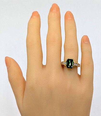Now to the gem. It’s a native natural gem of Maine, SparHawk mint green teal Maine tourmaline. It’s from a gem mine 28 miles north of our store, cut by a Maine Irish guy who is totally obsessed with gem precision and perfection. There is symphony and harmony in the balance and flow of light within the gem. It’s color and brilliance whispers Celtic beginnings.