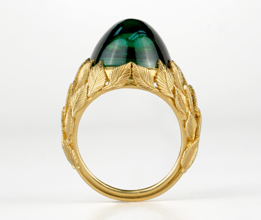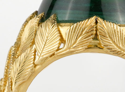 The ring itself is a study in master craftsmanship. Each leaf surrounding the stone was individually formed, carved, and set by hand—no shortcuts, no cast repetition. Every vein, every contour is intentional. The result is not just a setting, but a living structure built of gold and patience, wrapping the stone as though the leaves grew there naturally over time.