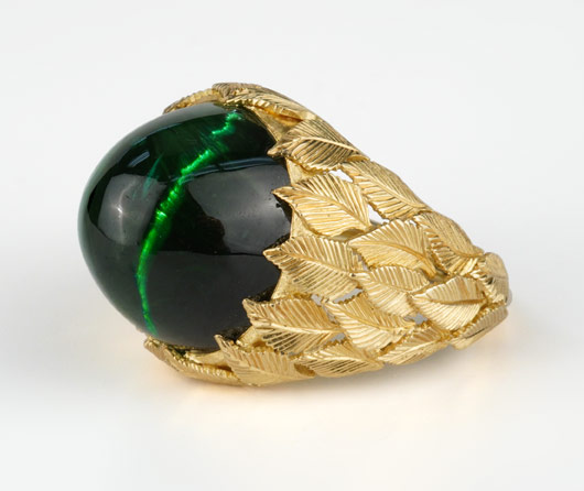 At its heart is a rare cat’s-eye green world tourmaline, dramatic in scale and alive with an inner band of moving light that glides across the surface as the ring tilts left and right. The eye, like a cat, is watching everything. It feels alert. Aware. As though it sees more than it should. You don’t just notice its presence—you feel it.