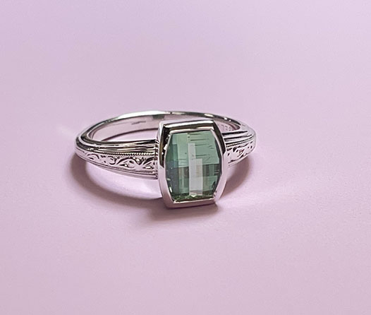 If you have twins you’re out of luck. If it’s your lady love you’re thinking of giving this to, there is one in the world. The twilight cut is magical because it chops light into little reflecting cubes of pastel green light that twinkles up and down the length of the gem. Should you have this? If she wanted a Maine tourmaline, if she likes white gold, and would love to have a one-of-a-kind ring today, this might be it. When this was made, gold was $2,450. Today gold is over $3,500 per ounce. It’s a really good value.