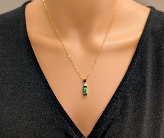 This is a great green tourmaline…world sourced. Looks remarkably like a Mount Mica, Paris, Maine tourmaline. It’s definitely not from Maine. The tourmaline was found somewhere else. The gem looks great. If it came out of the ground in Maine it would cost more. The necklace is solid, so well made that it could last 200-300 years.