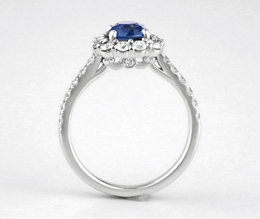 If I could, I would take the lady who wears this ring to dinner. A place with a maître d, bow-tied waiters with white shirts and black pants, with proper posture and all impeccably polite. The tablecloth is white linen, the napkins are white linen in a sterling silver oval with the restaurant’s monogram hand-engraved. The candles are real no-drip bee’s wax, white of course, lit by a special candle waiter. It’s a nice restaurant, the blue sapphire is brilliant. The 24 diamonds dazzle in white. All gems are set in white gold. All of our staff love this ring.