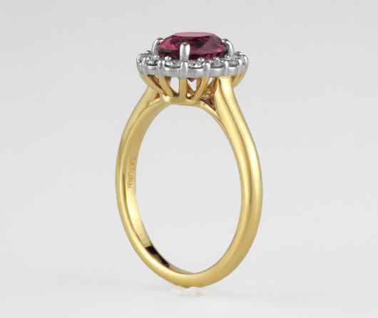 Simplicity. A big oval pink Maine tourmaline, a rare color, framed with 14 diamonds, It’s an easy ring to look at and easy to wear.