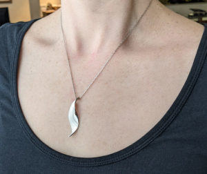 The earrings and necklace are both sterling silver. Their compound curves are smooth to the touch. A candle flame in a breeze catching light. A brilliant spark or two, shimmering at the neck and ears. The design is quick as a flash. Your prey is drawn closer; you are, tonight, the possessor of mystery. You are the mystery.