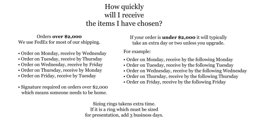 Cross’s shop is currently sizing rings within three business days. Online orders will indicate your expected delivery date.